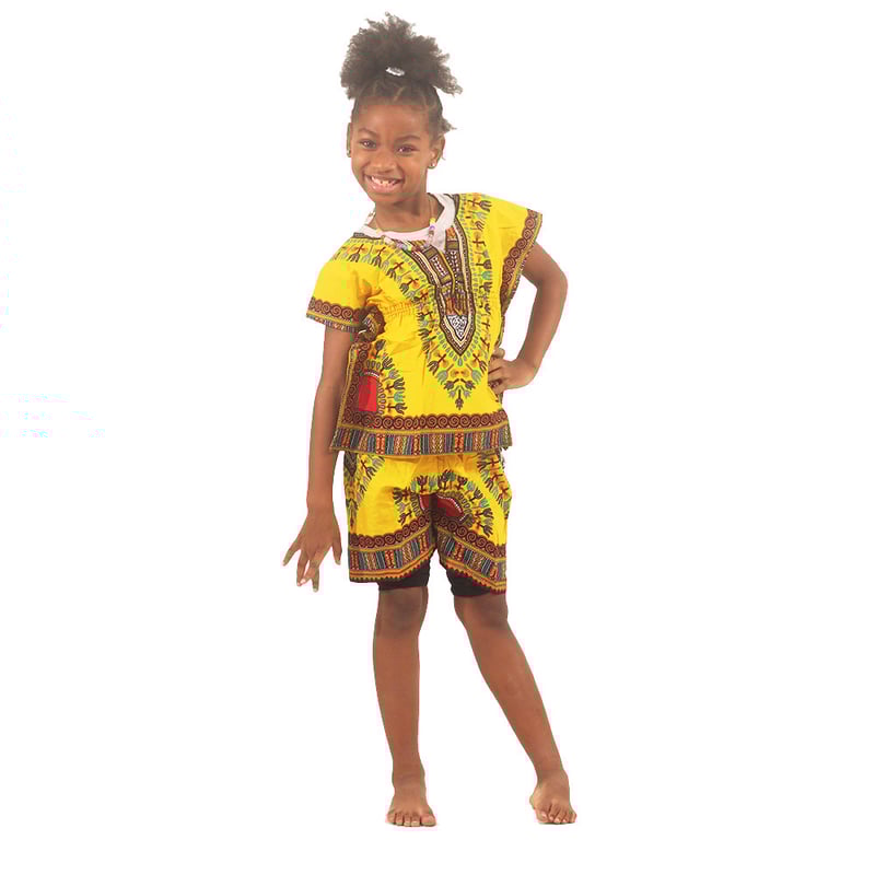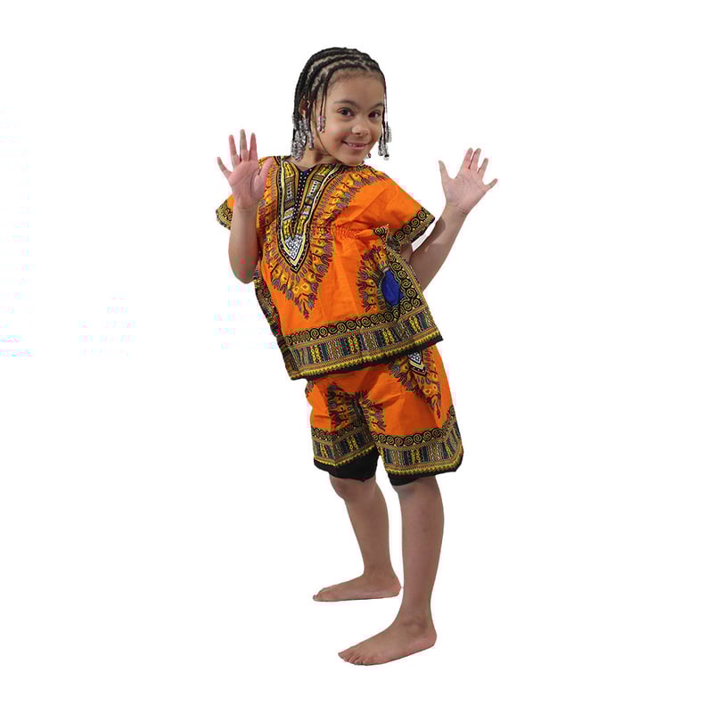 Dashiki has a form fitting elastic waist. 100% cotton.